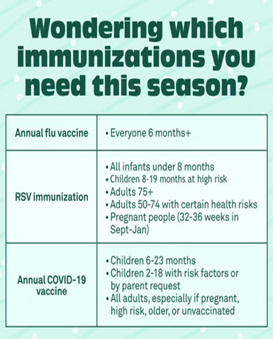 “We encourage everyone 6 months and older to get the flu shot as a simple way to protect yourself and help keep those around you healthy. If you have questions or concerns, talk with your provider or call our office to discuss,” says Dr. Karen Luparello, Medical Director. “Vaccines for Flu, COVID, Pertussis (whooping cough), Pneumonia, and RSV are widely available within our communities including local pharmacies, physician offices, and at your local health department office.”